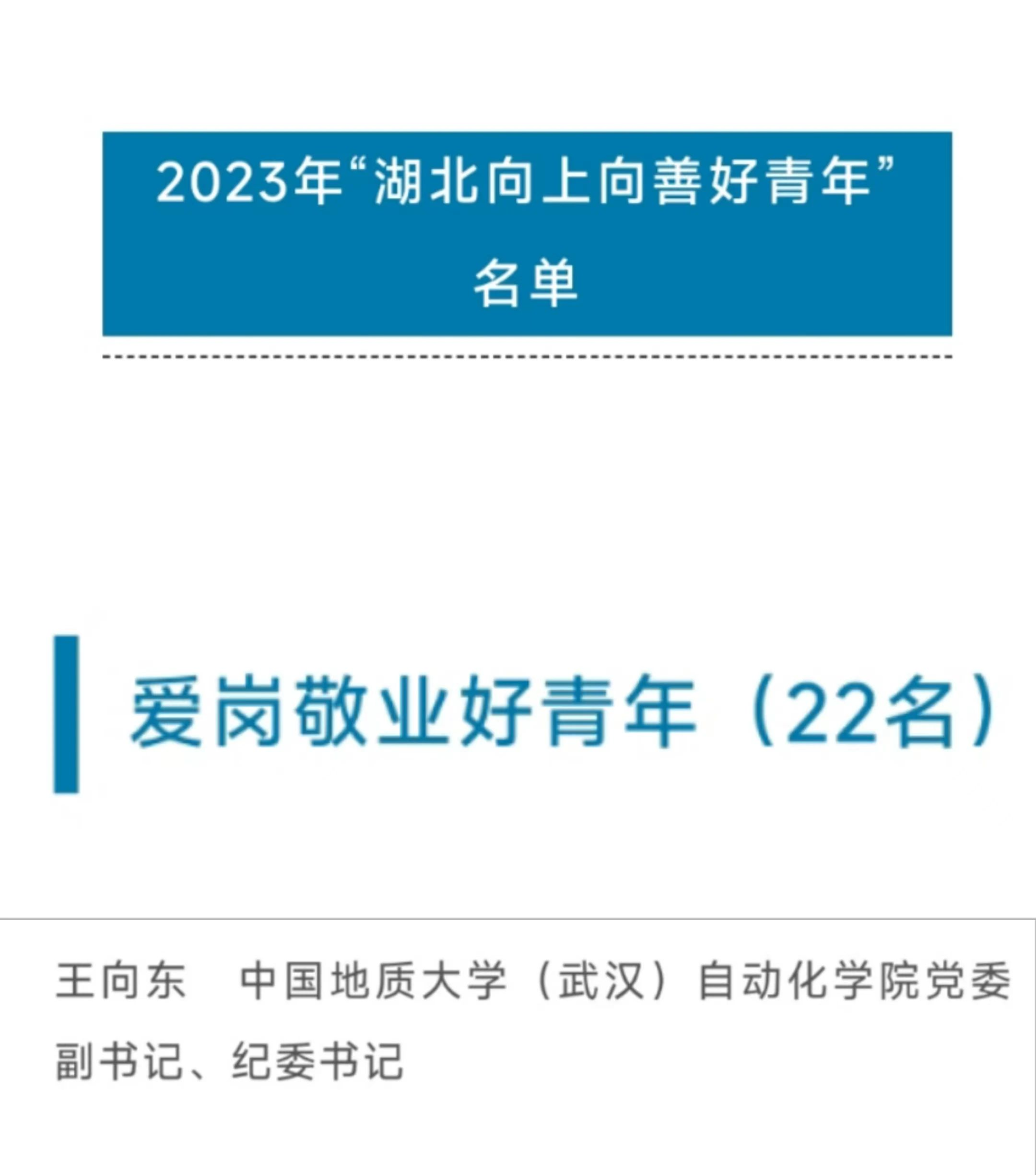 近日,共青团湖北省委公布了2023年“湖北向上向善好青年”主题寻访活动名单,我院王向东老师获评“爱岗敬业好青年”!