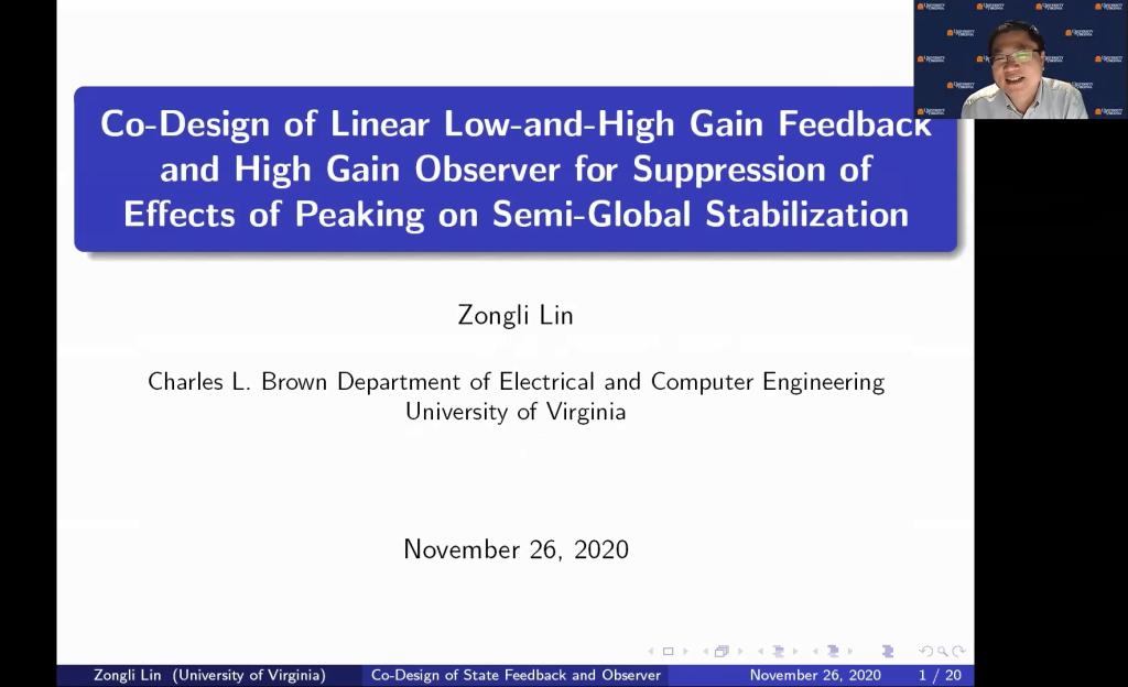11月26日,“2020复杂系统先进控制与智能自动化秋季学术研讨会——杰出学者报告会”顺利举行。美国弗吉尼亚大学林宗利教授作了题为《Co-Design of Linear Low-and-High Gain Feedback and High Gain Observer for Suppression of Effects of Peaking on Semi-Global Stabilization》的学术报告,新加坡南洋理工大学谢立华教授作了题为《Efficient Reinforcement Learning-Based Control of Uncertain Nonlinear Systems》的学术报告,美国纽约大学姜钟平教授作了题为《Reinforcement Learning and Optimal Control for Uncertain Systems》的学术报告,加拿大阿尔伯塔大学黄彪教授作了题为《Robustness in Data Analytics》的学术报告,加拿大阿尔伯塔大学陈通文教授作了题为《Advanced Alarm Analytics Tools Developed at the University of Alberta》的学术报告。